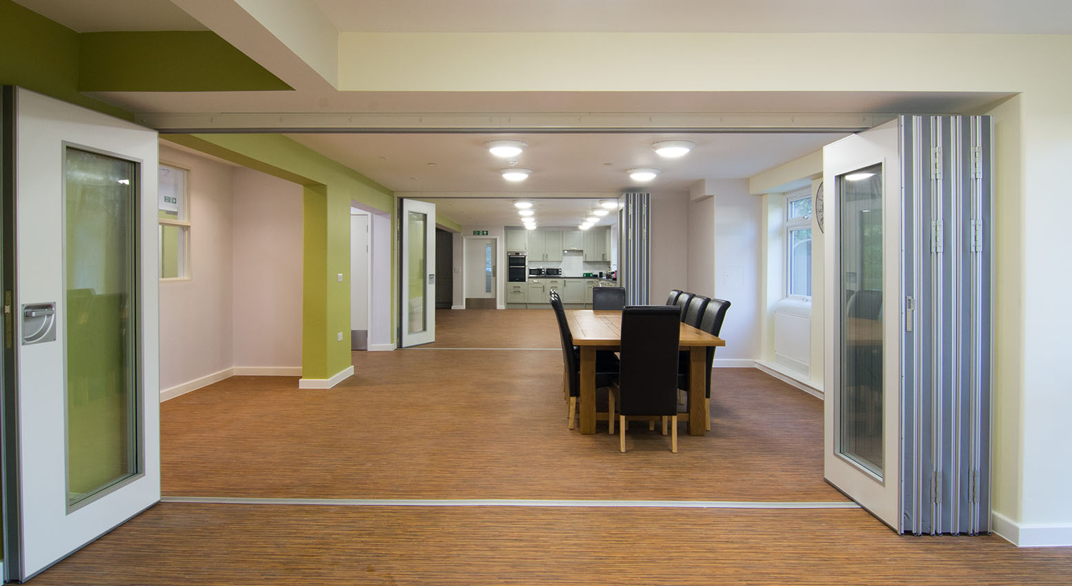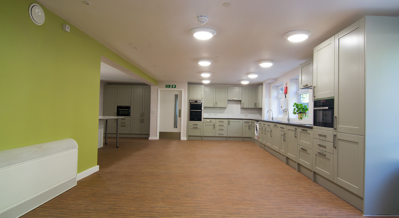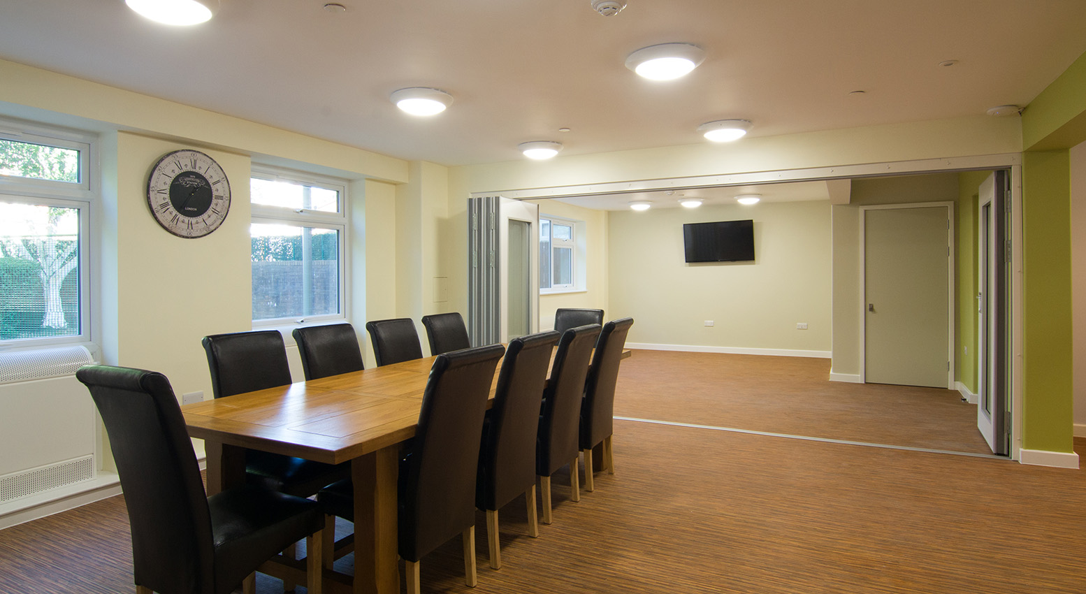 The scope of the project involved a comprehensive strip-out of the existing building, including the removal of internal walls and installation of new steel goal post supports on both the ground and first floor. Additionally, new partition walls were erected, and all new mechanical and electrical services were installed. The result was the creation of 11 new bedrooms, each featuring wireless handle access control, bespoke fitted wardrobes, and linen cupboards. Two large sliding folding partitions were also installed to divide the kitchen/living room/games room areas for enhanced flexibility. The centre has a fully adapted kitchen, an exercise and games room, a reablement room, an IT suite, and an accessible garden