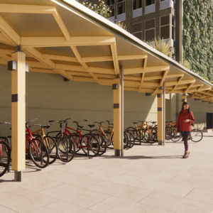 – Timber canopies featuring blue roofs for rainwater management and green roofs to support local ecology